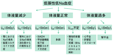 - 尿([Na+]+[K+]) > 血清[Na+] → 血清[Na+]低下